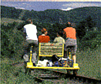 | Auf der Draisine haben bis zu 4 Erwachsene Platz. Zwei Personen (ab Körpergröße von ca. 1,50m) treten in die Pedale und bringen die Draisine voran. Auf der Sitzbank dazwischen können bis zu zwei Erwachsene oder drei kleine Kinder gemütlich mitfahren. Für Gepäck oder Fahrräder ist hinter der Sitzbank Platz, so dass sich die Draisinentour auch mit einer Rad - und Wandertour kombinieren lässt. | ||